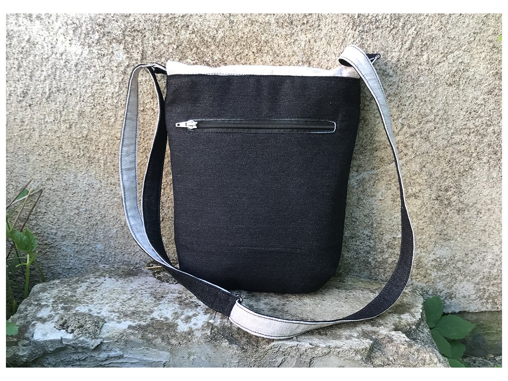 Kabelka s klopou ušitá z černé džínoviny a šedého lnu. Na přední straně a na klopě je zdobená nažehlovanou grafikou a malbou na textil.