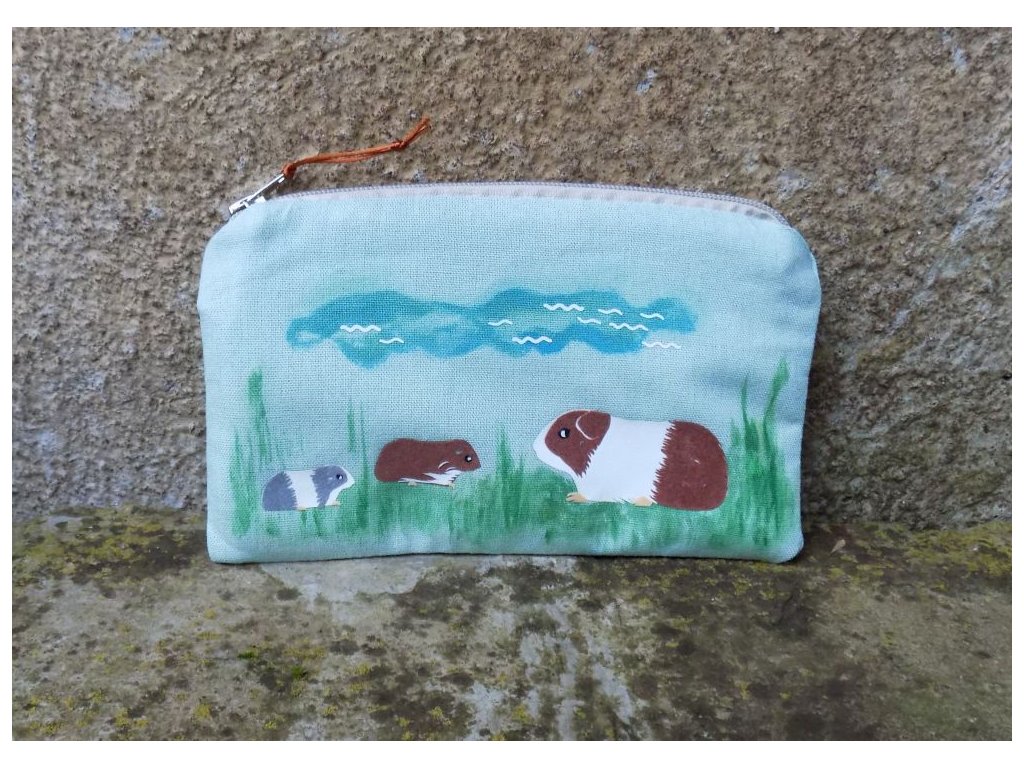 Kapsička ušitá ze světle zelené směsové látky (55 % len, 45 % bavlna), zdobená originální nažehlovanou grafikou a malbou na textil. Uzavírá se na zip.