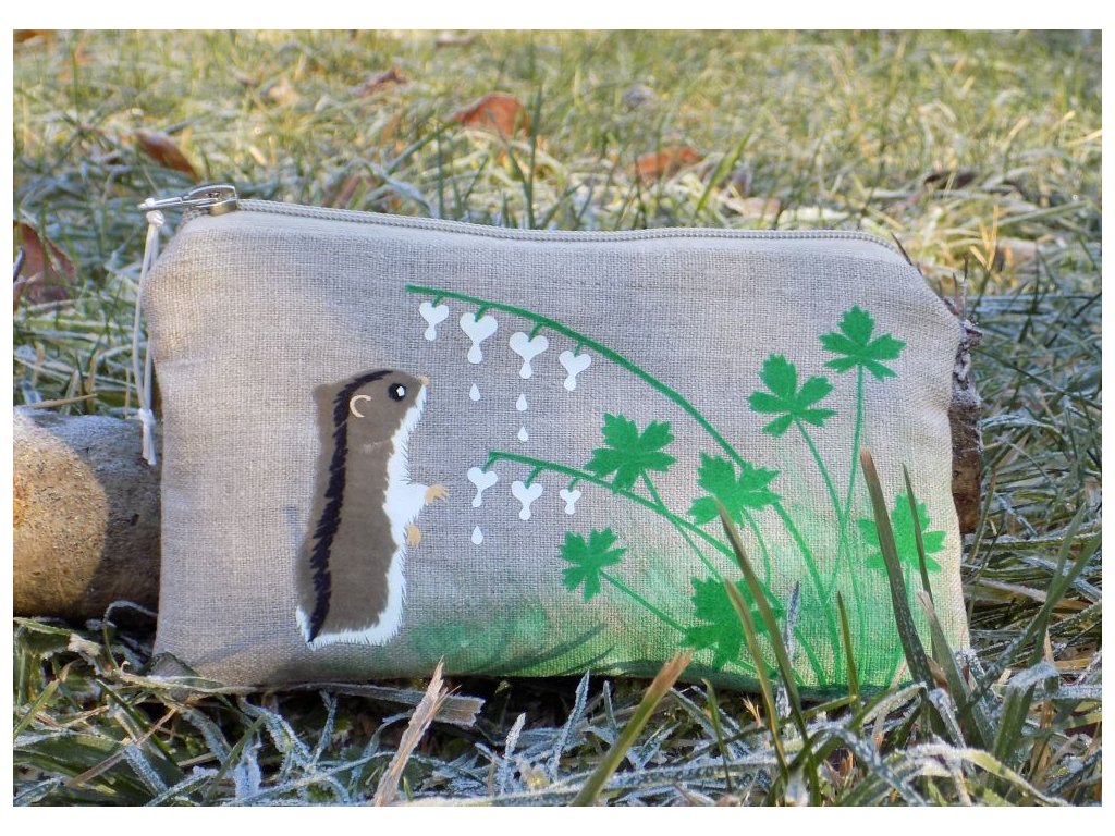 Kapsička ušitá ze lnu v přírodním odstínu, zdobená originální nažehlovanou grafikou a malbou na textil. Uzavírá se na zip.