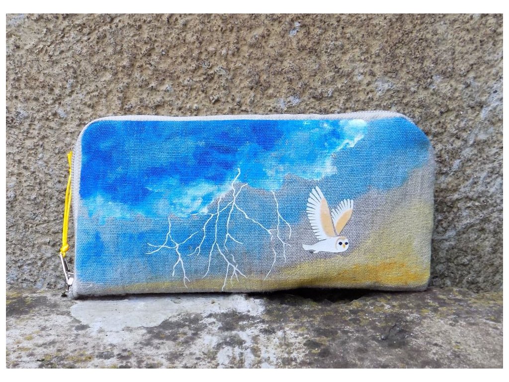 Pouzdro ušité ze lnu v přírodním odstínu a zdobené originální nažehlovanou grafikou a malbou na textil. Uzavírá se na zip.